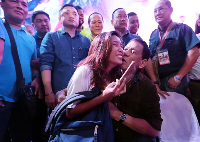 Ông Duterte hôn má một người phụ nữ trong buổi vận động tranh cử tổng thống. Ảnh: Inquirer |