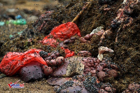 Những bao tải chứa xác động vật đang phân hủy, bốc mùi thối khủng khiếp, ruồi bọ vây quanh. Ảnh: Vietnamnet |