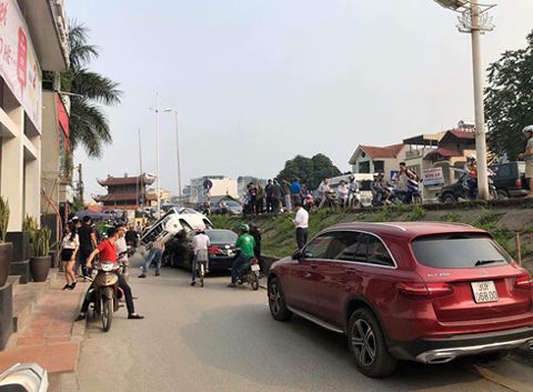 Nhưng vừa đi được một đoạn chiếc xe lao xuống vệ đường (cao khoảng 3 mét) rơi trúng xe ô tô nhãn hiệu Toyota Camry màu đen đang đỗ phía dưới.