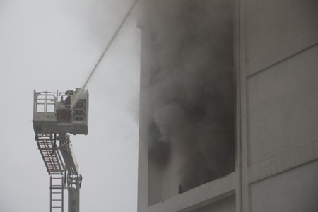 | | Lúc 8h40, lửa vẫn tiếp tục bùng cháy mạnh, lan lên các tầng phía trên. Tại hiện trường, lực lượng phòng cháy chữa cháy đã huy động 6 xe chữa cháy đến địa điểm để tiến hành dập lửa, lửa và khói vẫn bốc lên nghi ngút. Ảnh: Dân Trí |