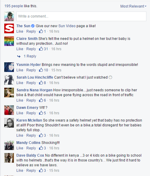 Sau khi xem đoạn clip, rất nhiều ý kiến trái chiều đã nổ ra. Hầu hết ý kiến đều chỉ trích người phụ nữ mà họ cho là mẹ của em bé. Đường phố đông đúc, "bà mẹ" được trang bị mũ bảo hiểm, còn đứa bé thì không. Hình ảnh nguy hiểm khiến nhiều người phải rùng mình.