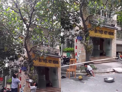 Thế nhưng người tính không bằng trời tính, mít thì hái được còn người đỡ thì không? Quả mít rơi trúng thau và đập mạnh vào đầu người đỡ. Hậu quả khiến chiếc thau bằng kim loại bị biến dạng, người đàn ông đỡ mít thì choáng váng và ngã xuống đường phải mất vài giây mới định thần lại được.