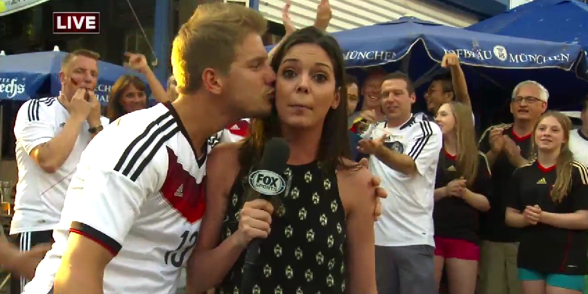 | Một fan cuồng táo bạo ôm hôn nữ phóng viên. |
