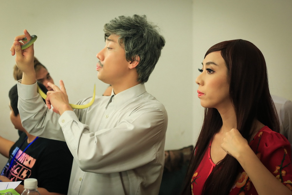 Đoạn clip ngắn 30s ghi lại cảnh trong hậu trường, nam MC nổi tiếng đang tranh thủ vừa ăn đậu phộng vừa lảm nhảm nói chuyện và “than khổ” về nghiệp diễn với… một con rắn nhựa thì “hoa hậu hài” Thu Trang bước vào. Để câu chuyện của mình thêm phần sinh động, Trấn Thành đã dùng gương mặt của Thu Trang để ví von cho hoàn cảnh cực khổ của người nghệ sĩ.