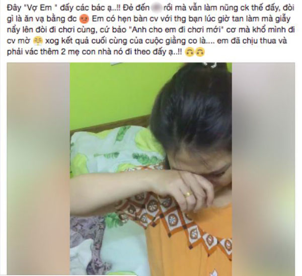 Thế mà cô vợ vẫn không chịu, đòi gì là ăn vạ bằng được: ‘Đi chơi cơ... huhu... 3 ngày vợ chưa được ra khỏi nhà rồi'.