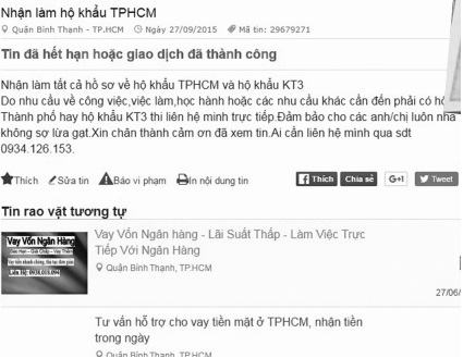 Quốc thừa nhận: “Hiện em chưa dám nhận thêm, bởi đang làm cho một số khách hàng, đến tuần sau mới có kết quả. Vì vậy, muốn làm sổ hộ khẩu, một vài tuần nữa gọi lại đi. Khi nào chắc ăn thì mới làm còn không thì thôi, không nhận bừa, làm mất uy tín”. Theo ghi nhận của PV, bên cạnh đó, hiện nay còn một số đối tượng chuyên đăng các tin quảng cáo, giới thiệu có thể nhập khẩu vào TP.HCM. Tuy nhiên, đây là những đối tượng lừa đảo, nhằm chiếm đoạt tài sản khi yêu cầu người làm chuyển tiền đặt cọc rồi biến mất dạng.