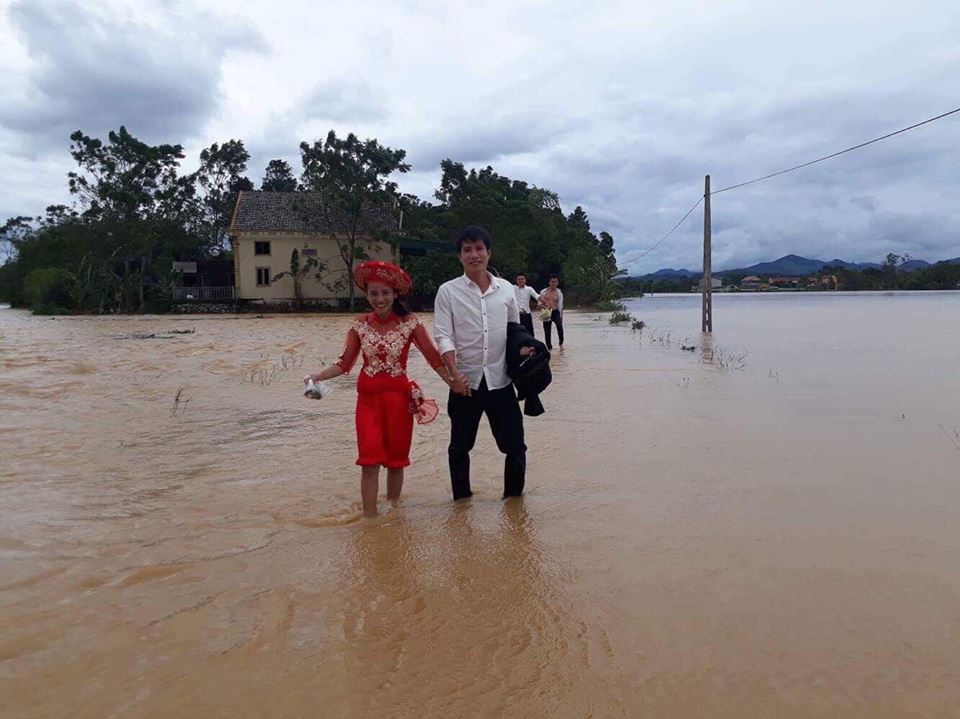 Gia đình nhà trai đã phải xắn quần ngang đầu ngồi vượt con đường ngập gần 1 km ra khỏi ngõ để đi rước dâu. Khi cô dâu về nhà trai, do đường ngõ vẫn ngập, nên được chủ rể chuẩn bị sẵn một chiếc thuyền hoa nhỏ để họ di chuyển vào hôn trường. Hình ảnh chú rể xắn quần lội nước kéo thuyền, còn cô dâu ngồi trên khiến nhiều người cảm động. Và đây có lẽ là một kỷ niệm đáng nhớ đối với cặp uyên ương này.