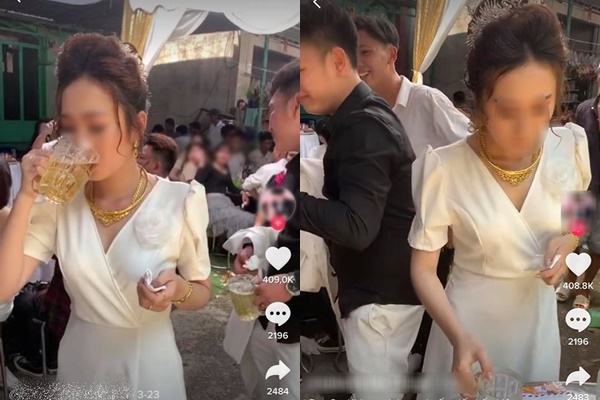 Mới đây, trên mạng xã hội chia sẻ đoạn clip ghi lại hình ảnh một cô dâu "ra mặt" uống cạn 3 cốc bia thay chú rể trước khi nhận phong bì mừng cưới khiến nhiều người xôn xao.