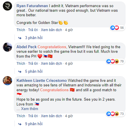 “Tôi đã xem trận đấu và thật tuyệt vời khi chứng kiến những người hâm mộ Việt Nam và Indonesia cháy hết năng lượng cổ vũ đội nhà. Chúc mừng Việt Nam nhưng Indonesia đã trận đấu tốt”, một tài khoản khác chia sẻ.