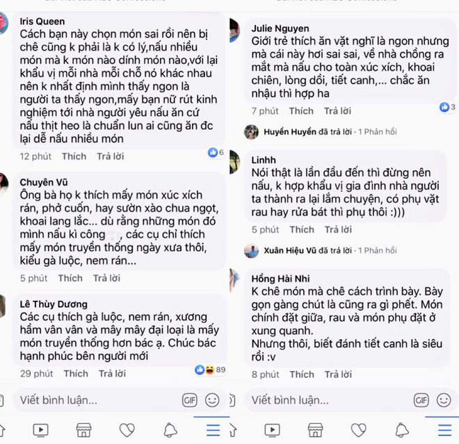 Một cô nàng có tên Lan Hương mới đây cũng gặp rắc rối khi bị chê về khoản nấu nướng. Theo Lan Hương chia sẻ, cô đã đã chuẩn bị kỹ càng. Thậm chí, cô còn cẩn thận nấu nhiều "món tủ" mời bạn bè ăn thử trước đó với mong có thể ghi điểm trong mắt bố mẹ chồng về khoản nữ công gia chánh.Thế nhưng, lần đầu ra mắt đã chẳng mấy suôn sẻ khi cô gái vẫn bị người lớn trong gia đình chồng chê: