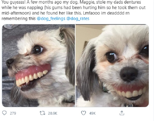 Câu chuyện của Eunice thu hút 49.000 lượt thích, 20.000 lượt retweet và hàng trăm bình luận. Quả thực, khó mà nhịn cười được với khoảnh khắc chó đeo răng giả như thế này!