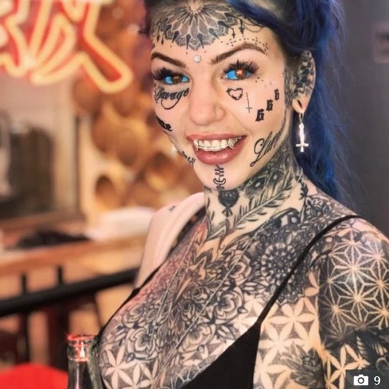 Với 200 hình xăm trên cơ thể và đôi nhãn cầu xanh, Amber tự gọi mình là Rồng Trắng Mắt Xanh. |