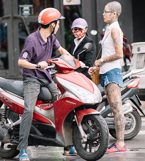 Ngoài việc sở hữu những hình xăm kín mít trên người, cô gái này còn táo bạo cạo trọc đầu và xăm kín khiến nhiều người phải ngoái nhìn.