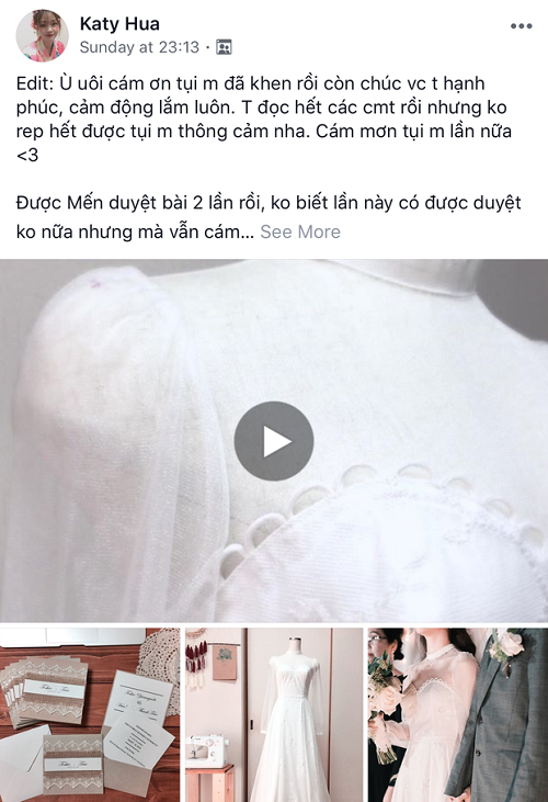 Thanh Trúc đã chia sẻ bài đăng về chuyện bản thân từng dành 3 tháng tự mình chọn vải, lên từng đường kim mũi chỉ và cho ra đời chiếc váy cưới trắng DIY đặc biệt. Chiếc váy có thể không bồng bềnh, không lung linh như ở cửa hàng nhưng nó chắc chắn đã giúp Trúc trở thành cô dâu xinh đẹp nhất.