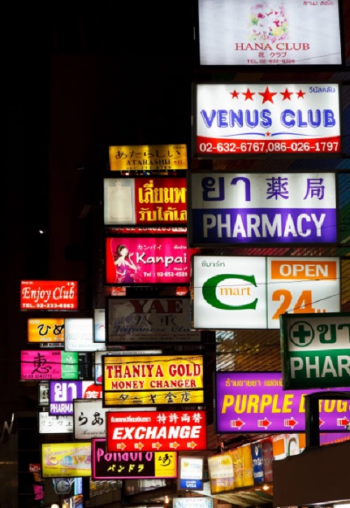 Những tấm biển quảng cáo trên phố Patpong. Ảnh: SCMP |