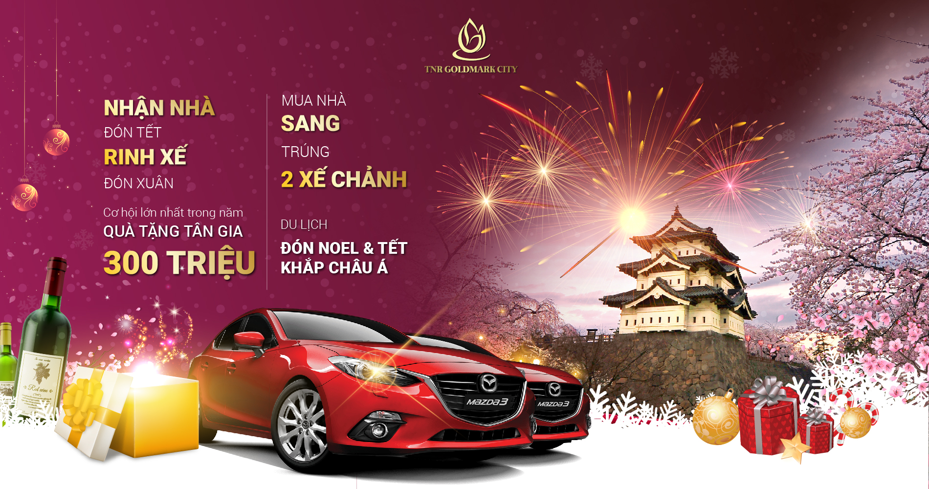 Ô tô Mazda 3, quà tặng tân gia 300 triệu, chuyến du lịch đón Tết dành cho cả gia đình tại khu nghỉ dưỡng 5 sao,… cùng nhiều giải thưởng hấp dẫn khác là những món quà tặng chỉ dành cho khách hàng khi mua nhà tại TNR Goldmark City trước ngày 31/12.