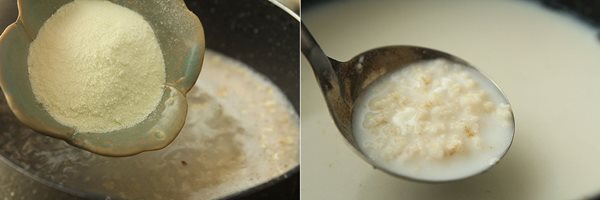 Đổ 500ml nước lọc vào nồi đun sôi, thêm yến mạch và sữa bột vào khuấy đều rồi đậy nắp đun ở lửa nhỏ trong 10 phút. Tiếp đó thêm chút đường vào khuấy tan.
