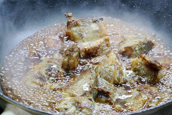 - Bước 3: Đổ bia vào chảo cá, thêm nước tương, gừng, hạt tiêu, giấm, đường và một chút nước vào đun sôi sau đó đun nhỏ lửa.