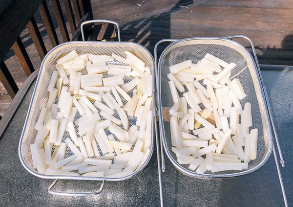 - Bước 2: Thêm muối vào thố củ cải trộn đều và để yên trong 2 giờ. Sau khoảng thời gian đó, đem củ cải vắt kiệt nước rồi rải ra rổ, phơi ngoài nắng khoảng 2-3 ngày (củ cải đạt là sau khi phơi giảm một nửa kích thước, mềm và khô khi chạm vào, không tiết ra nước khi vắt).
