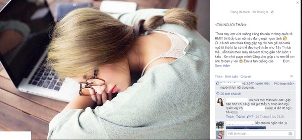 Hôm qua, trên một trang diễn đàn dành cho giới trẻ, một bạn nam giấu tên đã đăng một tấm ảnh chụp một cô gái vô cùng xinh đẹp đang ngủ gật cùng lời nhắn: "Trưa nay em vừa xuống căng tin của trường thì thấy bạn nữ này đang ngủ ngon lành. Ôi ,cả đời em chưa từng gặp người con gái nào mà ngủ tít thò lò lại có thể đẹp tuyệt trần như Tây Thi tái thế. Sẵn tiện theo máy ảnh nên em đứng gần bắn luôn một kiểu. Xin nhờ fanpage đăng cho giúp cho em để xin link Facebook bạn ấy với”.