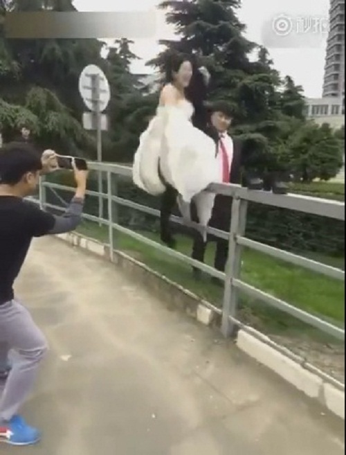Tình huống oái oăm này xảy ra trong lúc một cặp đôi người Trung Quốc đang say sưa chụp ảnh cưới, cô dâu thong thả bước trên hàng rào được làm từ những thanh sắt mỏng manh, còn chú rể mỉm cười hạnh phúc bước đi bên dưới, không quên cầm tay cô dâu và ngước nhìn bẳng ánh mắt đầy tình cảm.