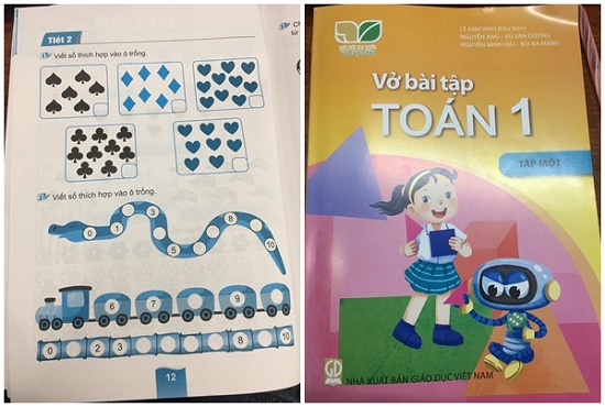 Ảnh minh họa trong vở bài tập Toán lớp 1 có xuất hiện những hình ảnh "cơ, rô, tép, bích" khiến nhiều bậc phụ huynh xôn xao.