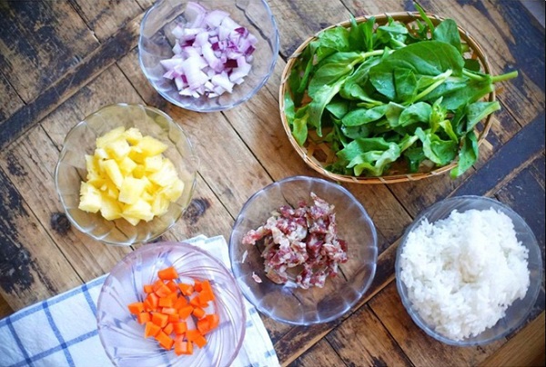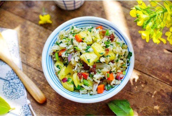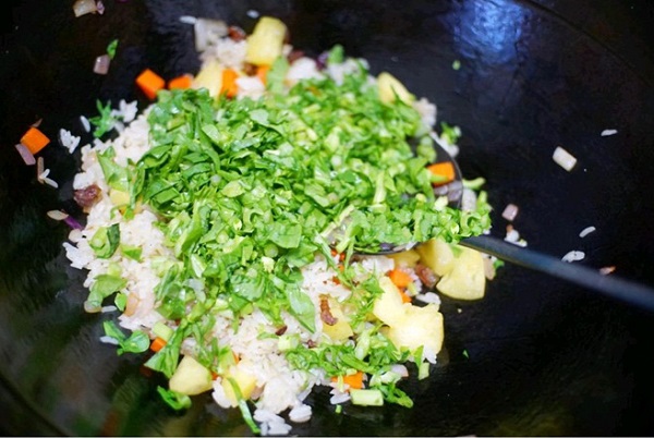 - Bước 3: Đổ cơm nguội vào chiên một lúc rồi thêm dứa vào đảo chung, nêm thêm chút muối cho vừa ăn.