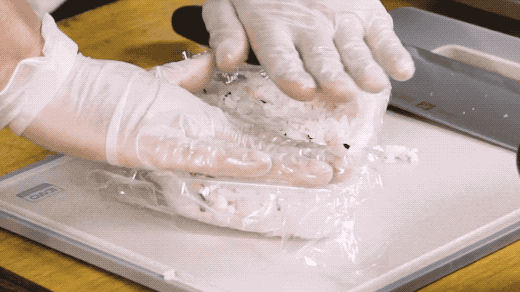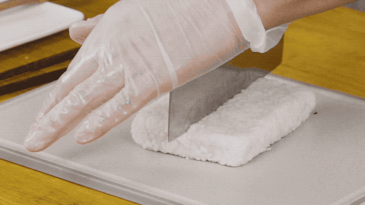 - Bước 3: Cho cơm ra khỏi khuôn, dùng dao sắc cắt cơm thành các miếng vuông nhỏ.