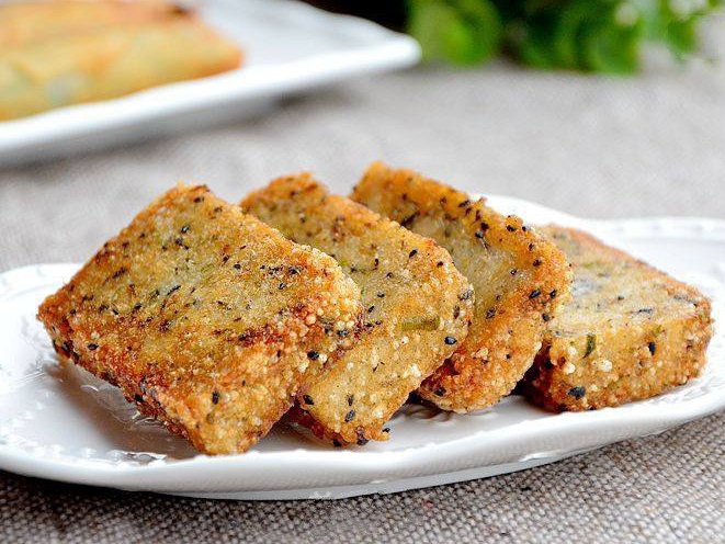 - Bước 4: Trong chảo chống dính, thêm ít dầu ăn, đun nóng, sau đó cho các miếng cơm vào chiên vàng đều các mặt thì vớt ra, để trên giấy thấm dầu.