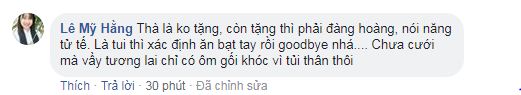 Một thành viên có nickname Lê Mỹ Hằng chia sẻ: "Thà là không tặng còn tặng thì phải đàng hoàng, nói năng tử tế. Là tôi thì xác định ăn bạt tai rồi goodbye nhá.... Chưa cưới mà vậy tương lai chỉ có ôm gối khóc vì tủi thân thôi".