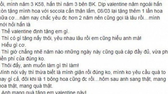 Chẳng biết có nên trách ko nữa…mình với hắn yêu nhau được hơn 2 năm rồi, mình năm 3 K58, hắn thì năm 3 bên BK. Dịp valentine năm ngoái hắn còn tặng mình hoa với socola cẩn thận lắm, 8.3 lại tặng thêm 1 lần hoa nữa cơ…năm nay chắc yêu đc hơn 2 năm nên cũng gọi là lâu rồi…mình mới hỏi hắn là: