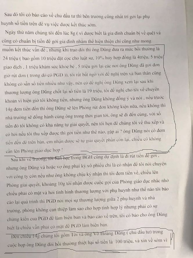 Tuy nhiên, khi đại diện trường đến nhà ông D. để bồi thường thì ông D. lại đưa ra mức bồi thường là 24 triệu đồng bao gồm các khoản: 10 triệu đặt cọc luật sư, 10% tiền hủy hợp đồng luật sư là 4 triệu, 5 triệu giao dịch, 1 triệu tiền khám sức khỏe bé và 5 triệu để để gửi cho các nơi ông đã gửi đơn tố cáo, giờ rút lại.