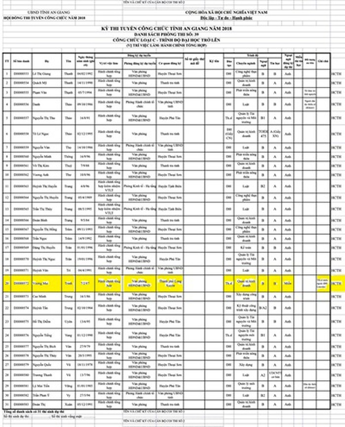 Cụ thể, trong kỳ thi công chức của tỉnh An Giang vào hai ngày 21 và 22/12/2018, tỉnh An Giang tổ chức kỳ thi công chức năm 2018. Theo đó có tổng số 1.259 thí sinh đăng ký dự tuyển; tổng số thí sinh thực tế tham dự kỳ thi là 920 thí sinh.