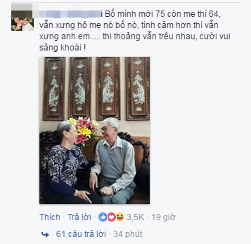 Bạn Công Thắng Bùi chia hình ảnh bố mẹ mình với dòng comment, “Bố mình mới 75 còn mẹ thì 64, vẫn xưng hô mẹ nó bố nó, tình cảm hơn thì vẫn xưng anh em..... thi thoảng vẫn trêu nhau, cười vui sảng khoái”.