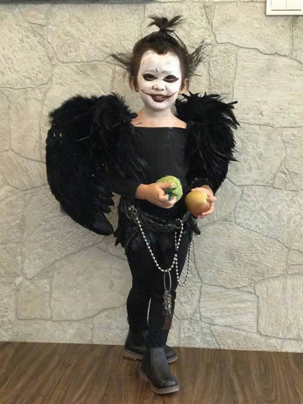 Lần này, phần hóa trang đã được mẹ MengMeng đầu tư công phu hơn. Không những phải chuẩn bị lông vũ đen, thắt lưng, táo, đồ chơi mà riêng phần xử lý lông vũ thôi đã mất gần 3 tiếng đồng hồ. Cuối cùng,thì công cuộc hóa trang cũng hoàn thành.