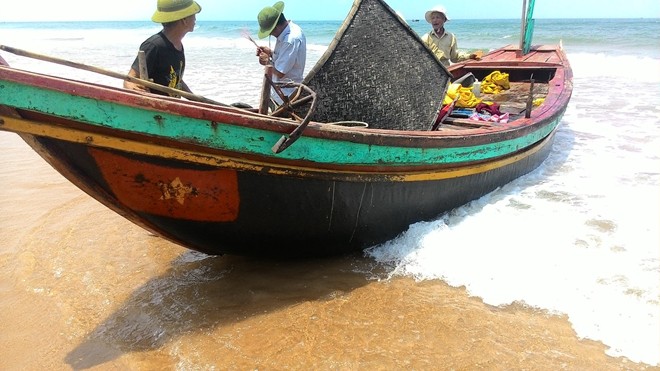 Thuyền câu của ông Thành được vớt lên đưa vào bờ. |