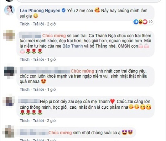 Dưới phần bình luận, rất nhiều bạn bè, đồng nghiệp và người hâm mộ gửi lời chúc mừng sinh nhật đến bé Bin và dành nhiều lời khen ngợi cho sự hoạt bát, lanh lợi và gương mặt chuẩn “soái ca tương lai" của quý tử nhà Bảo Thanh.