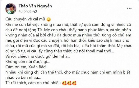 Sau đấy vài ngày, Thảo Vân chia sẻ thêm "phần 2" của câu chuyện. Cụ thể, nữ MC cho biết sau khi tiết lộ câu chuyện trên mạng xã hội, rất nhiều bạn bè và người hâm mộ đã ngỏ ý muốn mua chiếc mũ để tặng cho Tít. Đặc biệt, có một người bạn thân thiết của Thảo Vân đã bí mật gửi món quà đến gia đình nữ MC để tặng cho con trai.
