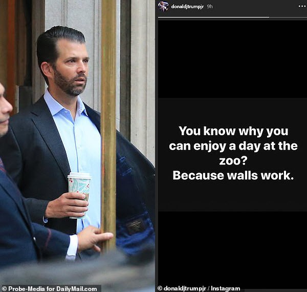 "Bạn có biết vì sao chúng ta có thể tận hưởng một ngày ở sở thú không?", ông Trump Jr. viết. "Bởi vì tường rào phát huy tác dụng". Dòng trạng thái này sau đó đã được xóa khỏi tài khoản của ông.
