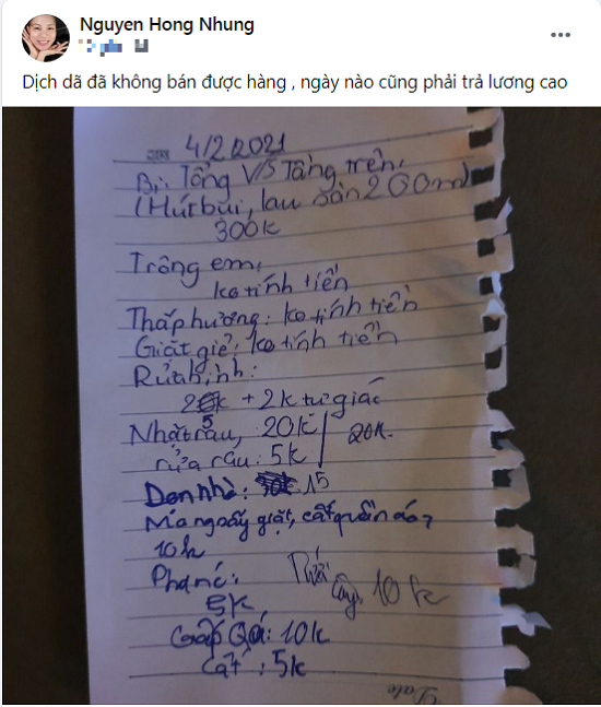 Mới đây, trên trang cá nhân, Hồng Nhung - bà xã Xuân Bắc đã thu hút sự chú ý của mọi người khi chia sẻ hình ảnh "bill thanh toán" mà cậu con trai Bi béo tính sau khi phụ mẹ làm việc nhà kèm dòng chú thích: "Dịch dã đã không bán được hàng , ngày nào cũng phải trả lương cao".