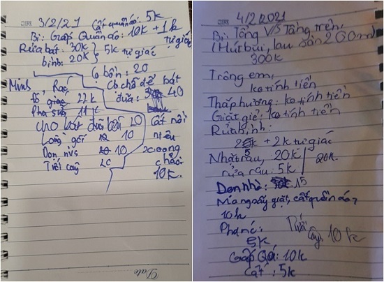 Cụ thể, Bi béo ghi số tiền mình sẽ được nhận khi làm việc nhà: "Hút bụi, lau sàn 200 m: 300 nghìn đồng, trông em: không tính tiền, thắp hương: không tính tiền, giặt giẻ: không tính tiền, rửa bình: 2 nghìn, nhặt rau, rửa rau: 20 nghìn, ...", tổng số tiền lên đến gần 400 nghìn đồng.