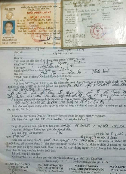 Biên bản có xác nhận vi phạm của anh Nguyễn Giang Nam. |