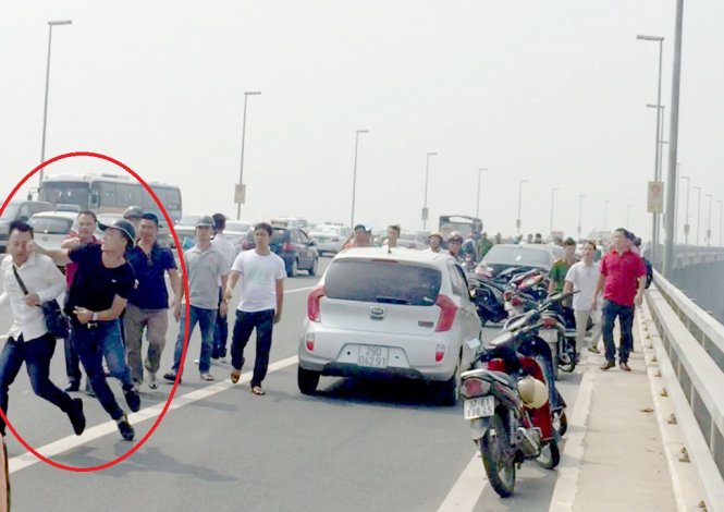 | Nhà báo Quang Thế (áo trắng) bị hành hung khi đang tác nghiệp trên cầu Nhật Tân - Ảnh - M.C. |