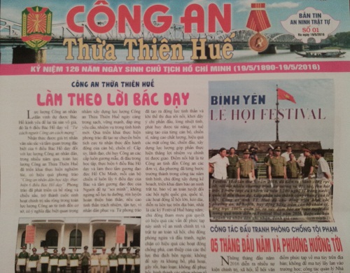 Chiều 19/5, Công an tỉnh Thừa Thiên - Huế long trọng trọng tổ chức buổi ra mắt “Bản tin An ninh trật tự (ANTT) Công an Thừa Thiên - Huế” số đầu tiên đúng dịp kỷ niệm 126 năm ngày sinh Chủ tịch Hồ Chí Minh (19/5/1890- 19/5/2016). Ấn phẩm này góp phần xây dựng lực lượng Công an tỉnh ngày càng vững mạnh, hoàn thành tốt nhiệm vụ được giao, xứng đáng với niềm tin yêu và kỳ vọng của Đảng, chính quyền và nhân dân Thừa Thiên - Huế.