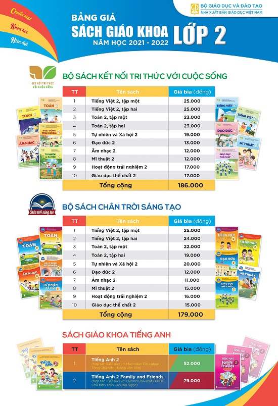 Đối với sách giáo khoa lớp 2, bộ sách "Kết nối tri thức với cuộc sống" có tổng cộng 10 cuốn (Tiếng Việt 2 tập một; Tiếng Việt 2 tập hai; Toán 2 tập một; Toán 2 tập hai; Tự nhiên và Xã hội 2; Đạo đức 2; Âm nhạc 2; Mỹ thuật 2; Hoạt động trải nghiệm 2; Giáo dục thể chất 2) có giá 186.000 đồng/bộ.