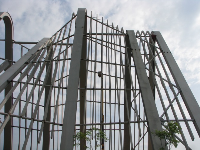 Cột chống sét lắp trên đỉnh cổng. Ảnh: VnExpress |