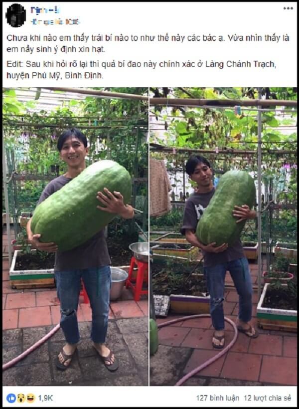 Người dùng Trần Hà bình luận: “Quảng Ngãi cũng nhiều lắm. Ngày trước nhà mình trồng 1 giàn quả to gần chạm đất phải lấy dây ràng lại, có đợi còn sập cả giàn. Ngày đó, không ai bán theo kg, chỉ cắt ngang thành khoanh tròn rồi mang bán.”