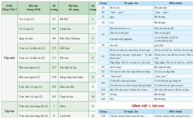 Theo đó, bài tập đọc "Cua, cò và đàn cá" (1) và (2) được bộ Giáo dục và Đào tạo yêu cầu chỉnh sửa, bổ sung ngữ liệu, nhóm biên soạn sách đã thêm hai bài đọc khác để bổ sung là "Kết bạn" và "Hồ sen".