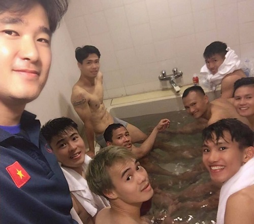 Tối qua 10/10, đội tuyển Việt Nam tiếp tục gieo sầu cho Malaysia tại sân vận động Mỹ Đình. Trở về khách sạn sau trận đấu, các cầu thủ của đội tuyển Việt Nam ngay lập tực ngâm nước đá lạnh để phục hồi thể trạng. Trợ lý HLV thể lực Park Sung-gyun đã nhanh tay ghi lại khoảnh khắc vui vẻ khi cả nhóm tuyển thủ cùng nhau ngồi trong bồn ngâm đá.