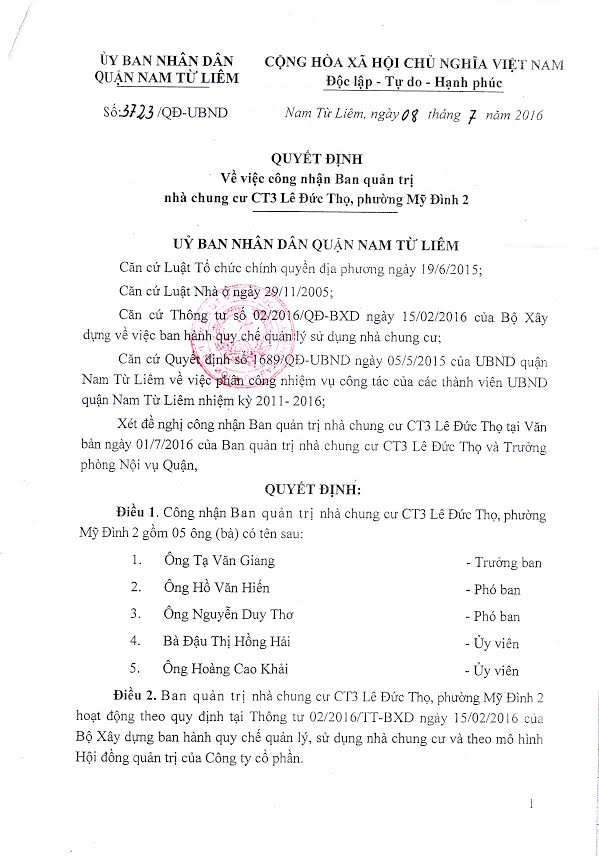 Quyết định công nhận BQT tòa nhà CT3 của UBND Quận Nam Từ Liêm. |